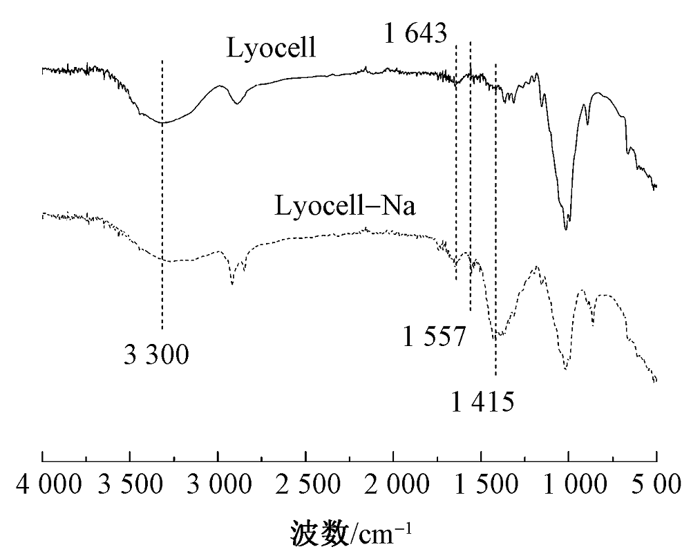 | 图2 莱赛尔纤维和羧甲基化纤维的红外谱图 |
