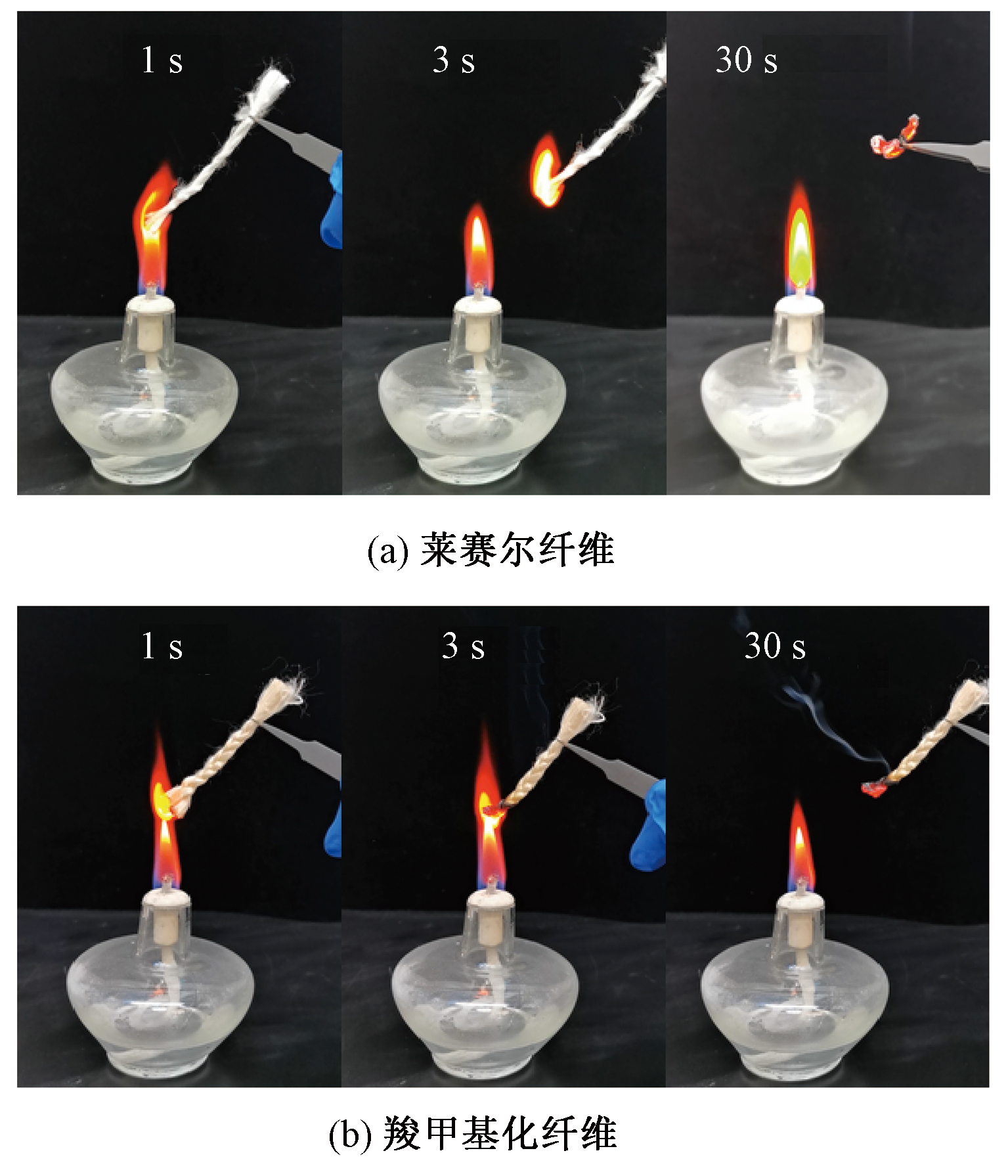 | Fig.4 Photos of alcohol lamp combustion test. (a) Lyocell; (B) Carboxymethylated fiber |