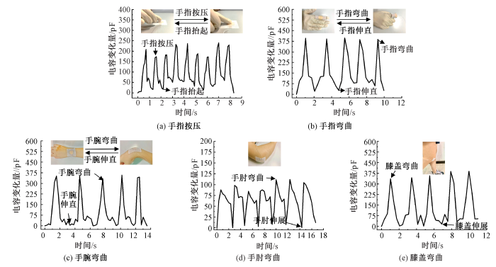 由图12(a)可知:随着手指的按压,传感器的电容迅速增大,电容变化量约为200 pF;当手指抬起,传感器的电容迅速恢复,实现了对手指按压的实时信号监测。图12(b)、(c)分别为手指弯曲和手腕弯曲的实时测试示意图。由图可知相比于手指按压的电容值,手指弯曲和手腕弯曲引起的传感器电容值更大,其电容变化量分别约为350 pF和400 pF。由图12(d) 和12(e)可知手肘弯曲和膝盖弯曲的电容变化曲线幅度和形状不同,该传感器可以分辨手肘弯曲和膝盖弯曲的运动情况。此外,与手部运动变化检测一样,对于手肘弯曲和膝盖弯曲,该离子传感器会根据弯曲的程度产生不同的电容,弯曲程度越大,产生的电容变化越大。可以得出,该离子传感器不仅可检测小幅度的人体运动,对于手肘弯曲、膝盖弯曲等这类大幅度的关节运动也可根据电容的变化量和电容变化曲线形状很好地分辨出来。