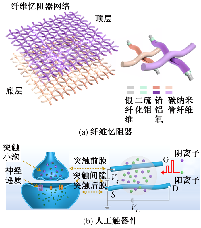 Fiber-based transistor for memristor and artificial synaptic device.(a) Fiber-based memristor; (b) Artifical synaptic device