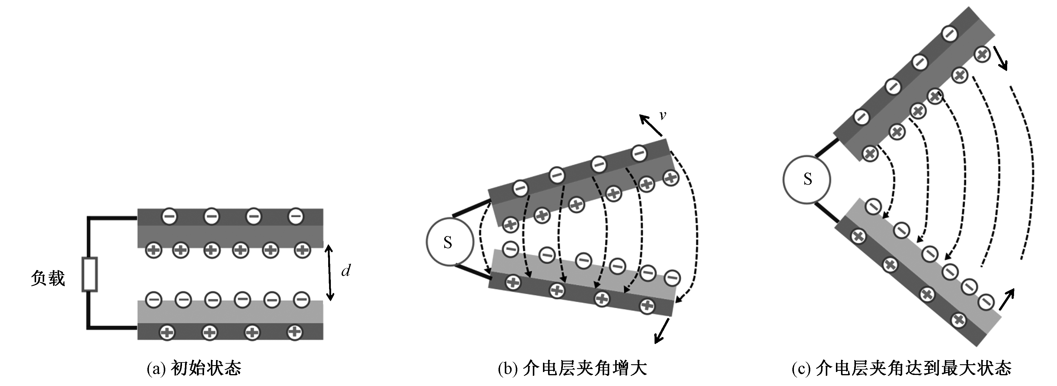 | Fig.1 Energy conversion process between electromagnetic radiation and TENG. (a) Initial state; (b) Angle between dielectric layers increases; (c) Angle between dielectric layers reaches maximum state |