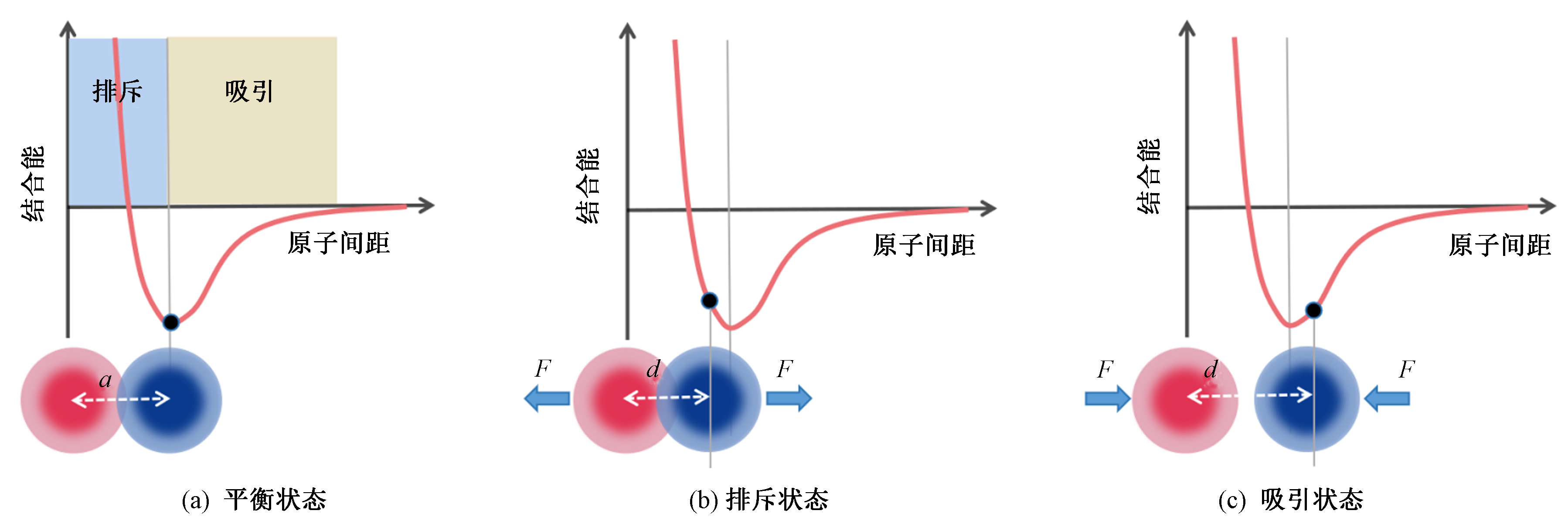| Fig.3 Interatomic interaction potential between two atoms. (a) Equilibrium position; (b) Repulsive region; (c) Attractive region |