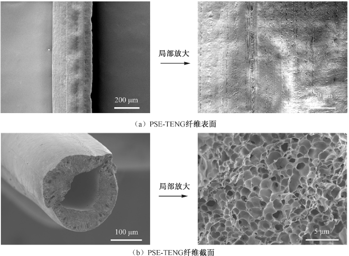 将PSE-TENG纤维放入液氮中,用锋利刀片切断,获得平整切面,用于观察纤维截面。将PSE-TENG纤维固定在铜胶带基底上,用于观察纤维表面。先用离子溅射仪喷金处理30 s,再用扫描电子显微镜观察PSE-TENG纤维的截面和表面形貌。