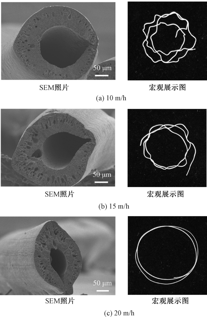由图3可知,当收丝速度增加时,纤维的芯层空间会逐渐变小,纤维宏观结构从无规弯曲变为直线型。这是因为收丝速度的增加导致纤维在凝固浴中受到更大的拉伸牵引作用,使芯层被压缩,纤维被拉直。由图4(a)可知,仅提高PVDF-HFP纺丝液质量分数(20% PVDF-HFP/DMF),此时纺丝液含量过高,纤维在凝固浴中难以充分固化,使得纤维在收丝过程中变形,无法形成预设的皮芯结构。由图4(b)可知,仅增加芯片通道长度时,因为芯层与皮层溶液之间存在较长的接触时间,且存在微小湍流或扰动的可能性增加,提升了二者之间扩散的机会,同时流体速度的变化以及剪切效应的增加,共同导致芯层与皮层之间存在界面不稳定,发生部分混合,使得纤维难以形成稳定的皮芯结构[22]。因此,为了稳定制备具有皮芯结构的PSE纤维,本文最终采用收丝速度为20 m/h、PVDF-HFP纺丝液质量分数为12.5%、芯片通道长度为1.5 cm的纺丝参数。