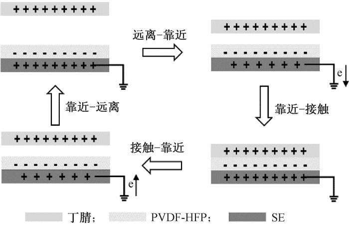 图6示出TENG的工作原理。SE芯层作为导电电极材料,PVDF-HFP皮层作为负摩擦电材料。可看出,当PSE-TENG与丁腈远离时,二者表面未发生电荷转移。当PSE-TENG与丁腈靠近时,由于PVDF-HFP的高表面电子亲和力, 丁腈表面与PSE-TENG的PVDF-HFP皮层表面产生极性相反的电荷,负电荷从丁腈表面转移至PVDF-HFP表面。PVDF-HFP表面上未屏蔽的负电荷吸引SE中的正电荷移动到SE/PVDF-HFP界面,进行电荷补偿。而SE中的负电荷移动到SE与铜导体之间的界面,铜导体中的自由电子流向地面。当PSE-TENG与丁腈完全接触时,系统整体电荷得到平衡。但如果PSE-TENG与丁腈重新分离,电荷的运动逆转,自由电子从地面流向铜导体。当PSE-TENG与丁腈完全远离时,系统整体电荷得到平衡,没有电信号输出。总之,如果PSE-TENG与丁腈反复接触-分离,则输出信号是循环的,且符号相反[26-27]。图7(a)示出用于自动循环测试的设备。该设备用于定量评估PSE-TENG性能在恒定频率(0.5~3 Hz)下响应恒定负载压力(2~12 N)的长期稳定性。由图7(b)可知,在相同压力下,输出电压V与接触频率呈正相关。V=QR/t,其中Q为每个接触产生的传递电荷,t为接触时间[28]。在这种情况下,Q被当作常数,因为接触面积本质上是常数。也就是说,该式表明,工作频率越高,PSE-TENG电极与地之间的电荷转移越快,从而输出电压随着外部负载频率的增加而增加。这种特性适用于高频(例如瞬时运动或振动)传感应用,因为信号强度随着测试频率的增加而呈线性增加。