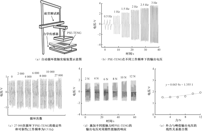 (a) Schematic illustration of automatic cyclic contact test device; (b) Output voltages of PSE-TENG at different working frequencies; (c) Stability and reliability of PSE-TENG at 27 000 cycles with working frequency of 0.5 Hz; (d) Output voltages of PSE-TENG in response to periodic compression with different contact forces applied; (e) Fitting diagram of linear relationship between external force and peak output voltage