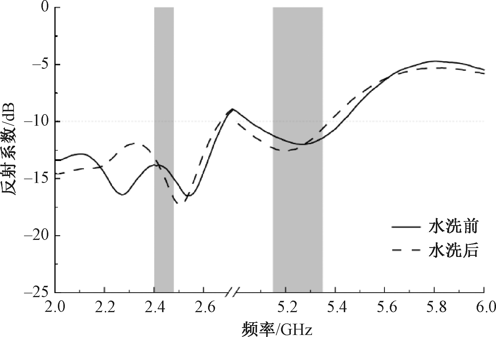 | 图11 Wi-Fi双频织物天线水洗前后的反射系数 |