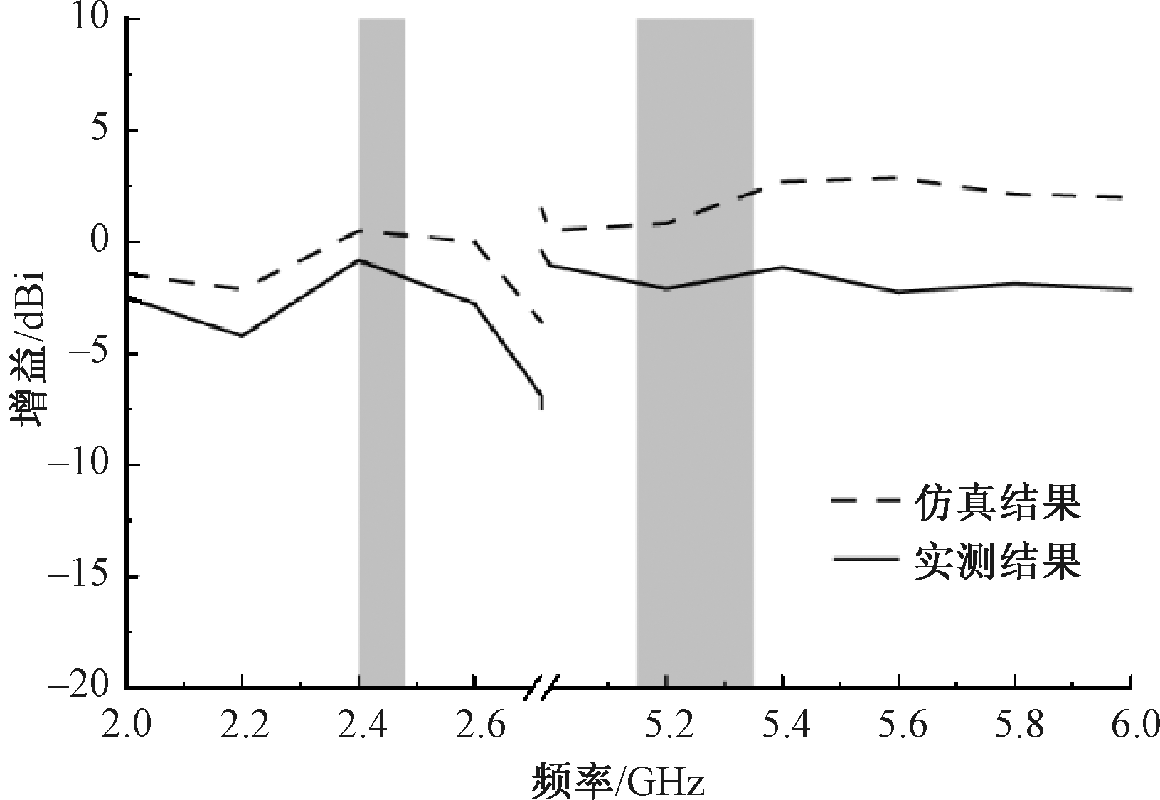 | 图7 Wi-Fi双频织物天线增益的实测和仿真结果 |