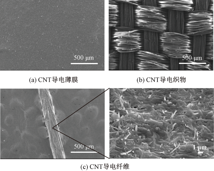 采用场发射电子扫描显微镜观察CNT导电薄膜、CNT导电纤维和CNT导电织物的表面形貌。