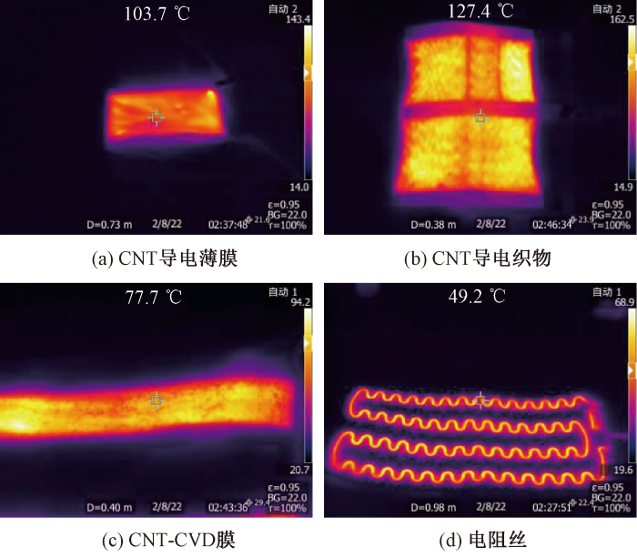 从4组发热试样的表面温度方差数据可看出,表面温度均匀性排序从优到差为:CNT导电薄膜、CNT-CVD膜、CNT导电织物、电阻丝。