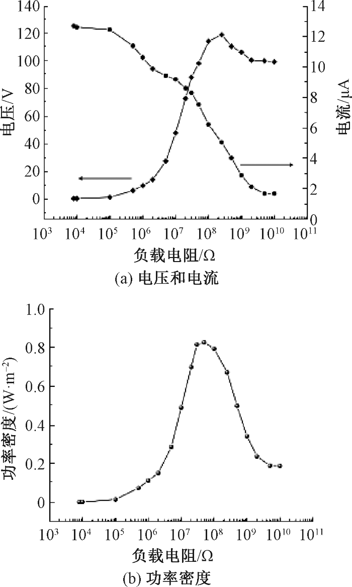 不同电阻负载下TENG的输出电压、电流和功率密度