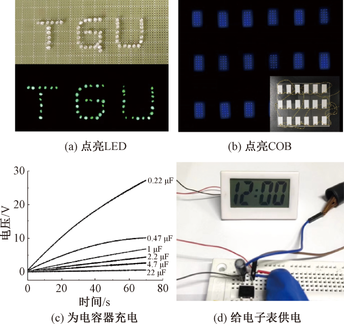 图13(a)、(b)示出TENG为发光二极管(LED)灯和板上芯片(COB)灯提供电力的情况。可以看出,该TENG可点亮LED灯或18个蓝色COB灯。此外,TENG还能为不同容量的电容器进行充电。图13(c)示出TENG为不同容量的电容器充电的电压-时间曲线。可见,经充电70 s后,0.22、0.47、1、2.2、4.7、22 μF的电容器的电压分别可达27.26、10.28、6.87、4.55、2.80、0.60 V。图13(d)示出由TENG充电的电容器为电子表供电的情况。当TENG为1 μF的电容器充电14 s后,其电压可达到1.6 V,能驱动电子表工作。这充分展示了TENG为微型电子设备持续供电的应用潜力。