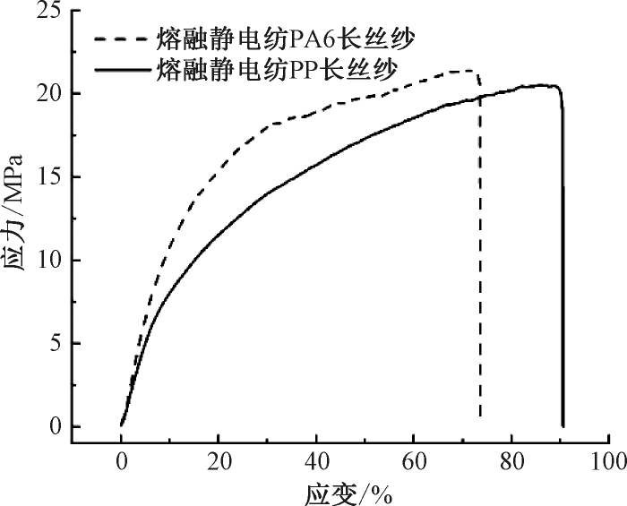 图 2 示出熔融静电纺PP和PA6长丝纱的应力-应变曲线。可以得出:PP长丝纱的断裂强度为20.4 MPa,断裂伸长率为90%;PA6长丝纱的断裂强度为21.3 MPa,断裂伸长率为72%。这表明长丝纱在实际使用过程中能够承受一定的外部应力和变形。