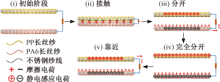 本文采用熔融静电纺丝技术制备了聚丙烯(PP)和聚酰胺6(PA6)长丝纱,并结合不锈钢纱线构建了织物基摩擦纳米发电机(TENG)。熔融静电纺纱具有较小的纤维直径和优异的力学性能,可增加织物的粗糙度和有效摩擦面积,在摩擦电效应中表现出显著的优势。与商用PP和PA6长丝纱构建的TENG相比,基于熔融静电纺长丝纱的TENG不仅表现出了高电压和电流输出,分别是基于商用长丝纱的TENG的41倍和95倍,还展示了良好的长期使用稳定性和耐用性。本文研究为TENG的性能优化提供了新的思路,并展示其在可穿戴电子设备和自供电系统中的广泛应用前景。