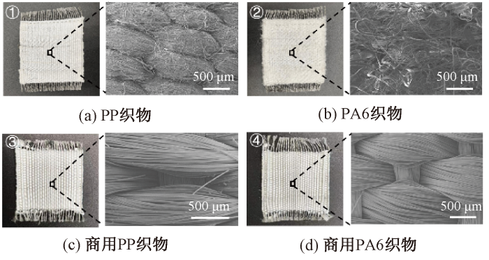 (a) PP fabric; (b) PA6 fabric; (c) Commercial PP fabric; (d) Commercial PA6 fabric