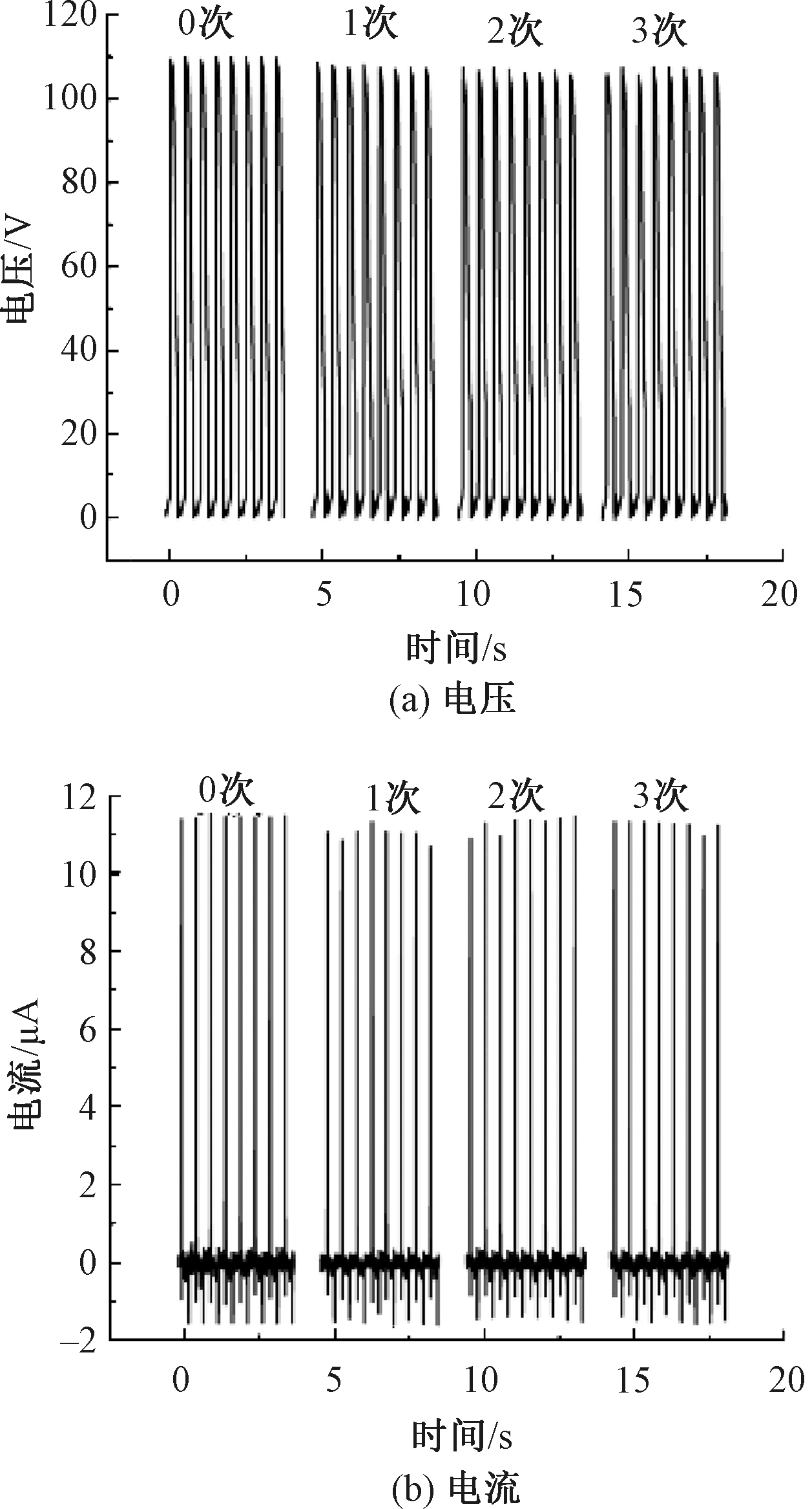 | Fig.11 Washing durability of TENG under different washing cycles. (a) Voltage; (b) Current |