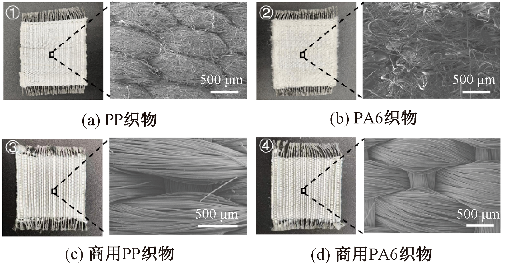 | Fig.6 Real photoes and SEM images of four fabrics. (a) PP fabric; (b) PA6 fabric; (c) Commercial PP fabric; (d) Commercial PA6 fabric |
