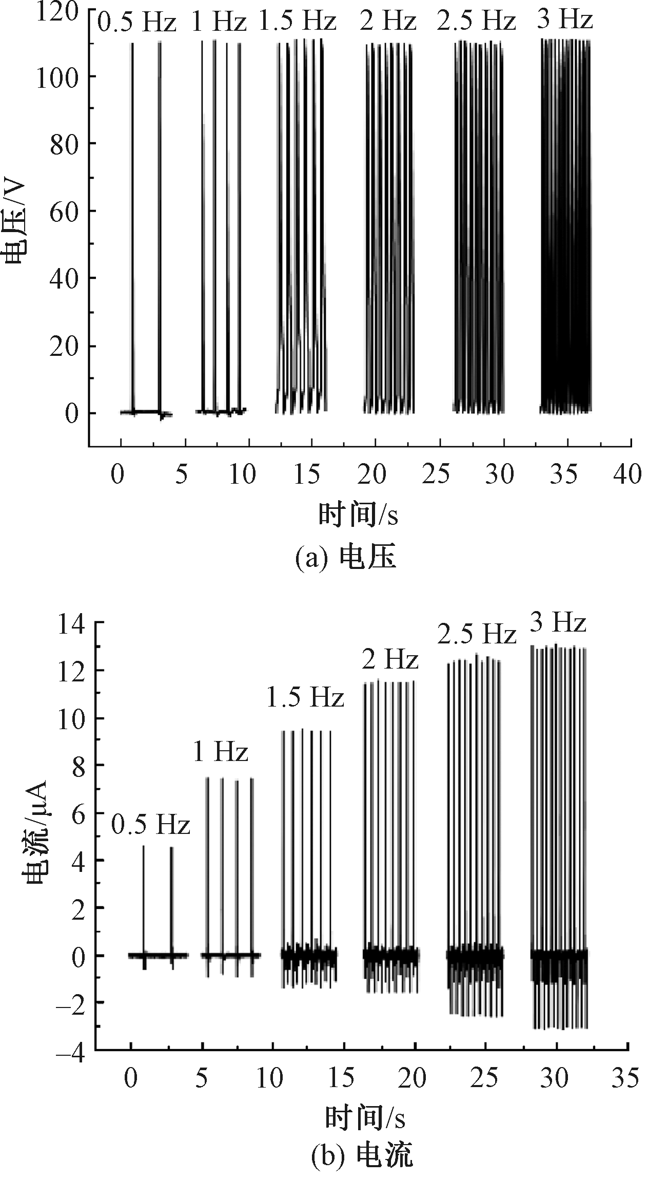 | Fig.9 Output performance of TENG under different frequencies. (a) Voltage; (b) Current |