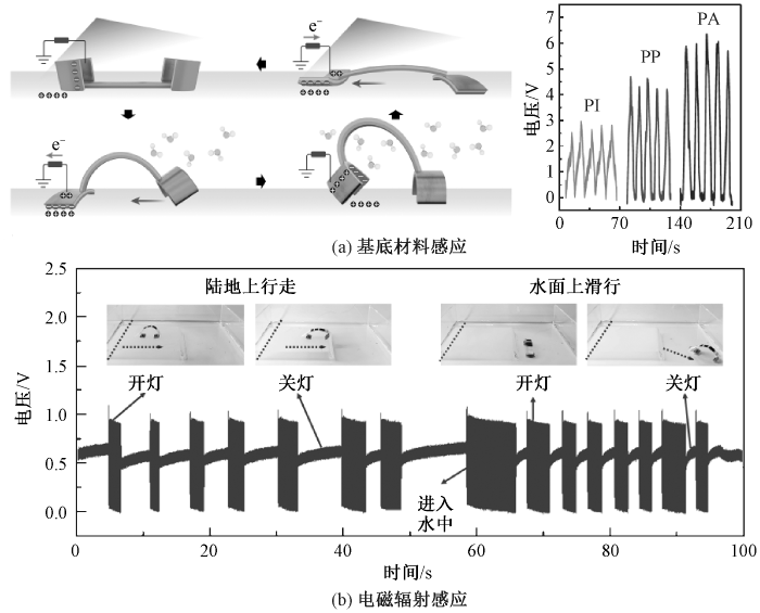 相比纤维或纱线,纤维膜在结构、材料与功能方面具有极高的可设计和编程性,有望在驱动和传感功能上赋予更多可能性[77]。东华大学熊佳庆课题组[14]通过连续静电纺丝制备了MOF/PEO-MXene/PVDF非对称响应双层纤维膜驱动器。该驱动器能够双向响应光热和湿气刺激,通过纤维结构、取向和厚度协同设计,证实了二维-三维结构可编程的多样化驱动器。结合摩擦电效应,实现了驱动器自感知能力,例如可感知物体温度/湿度、识别基底材质、环境湿度/光强,以及昆虫等刺激(见图6(a))。此外,该课题组针对环境中的电磁辐射(EMR),利用尺蠖和竹排启发,设计了一种具有水-陆自适应运动的微纤维基两栖软体机器人,其在红外光照射下可连续行进,并基于电磁感应原理实现运动过程中EMR的动态感知(见图6(b))[57]。