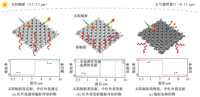 (a) Radiative cooling fabrics with high infrared transmittance; (b) Radiative cooling fabrics with high infrared emissivity; (c) Radiative heating fabrics