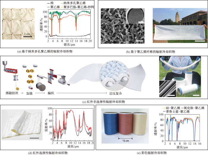(a) Radiative cooling fabrics based on nano porous PE; (b) Radiative cooling fabrics based on PE fiber; (c) Radiative cooling fabrics with non-selective MIR emittance; (d) Radiative cooling fabrics with selective MIR emittance; (e) Colored radiative cooling fabrics with high MIR transmittance