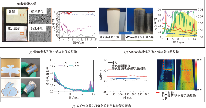 (a) Radiative warming fabrics based on Ag/Nano PE; (b) Radiative heating fabrics based on MXene/Nano PE; (c) Radiative warming fabrics based on Ti anodization
