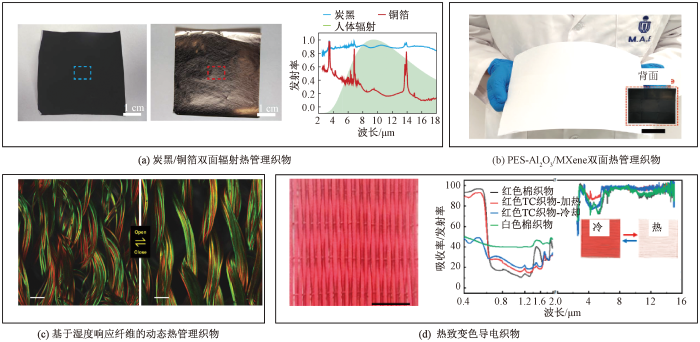 (a) Dual-mode radiative thermal management fabrics based on carbon/Cu foil; (b) Dual-mode radiative thermal management fabrics based on PES-Al2O3/MXene; (c) Dynamic radiative thermal management fabrics based on humidity-responsive fiber; (d) Thermochromic conductive fabrics