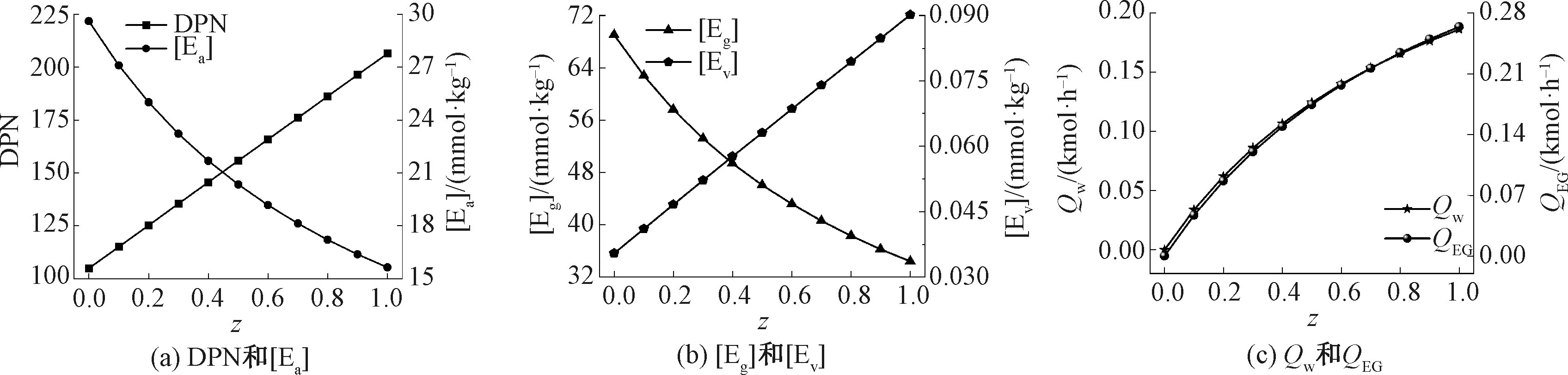 | Fig.4 Distribution of components of liquid phase polyerization falling film kettle outside tube. (a) DPN and [Ea]; (b) [Eg] and [Ev]; (c) Qw and QEG |