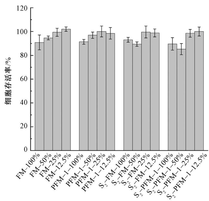 采用 CCK-8 法检测内皮细胞活性,评估 FM、PFM-1、S2-FM、S2-PFM-1这4种纤维材料的细胞相容性。首先,在无血清培养基中对4种材料样品进行浸提,得到初始浸提液(记为100%浸提液);再对其进行不同比例的稀释,得到初始浸提液的体积分数分别为12.5%、25%、50%、100%的浸提液(记为 “材料名称-初始浸提液的体积分数”,如 FM-100%);其次,将内皮细胞接种于装填有上述浸提液的 96 孔板,在适宜条件下预培养 24 h;再向各孔中加入 CCK-8溶液,培养箱内避光培养 4 h 后获得液体产物,通过酶标仪检测各孔中液体产物在450 nm 波长处的吸光度值,通过下式计算细胞存活率细胞存活率C,以评估细胞活性。