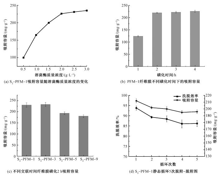 为探究影响PFM系列纤维膜吸附溶菌酶能力的关键因素,实验围绕溶菌酶初始质量浓度、磺化时间、纤维膜类型及循环性能展开分析。在溶菌酶初始质量浓度影响方面,随浓度升高,纤维膜吸附容量显著提升,当质量浓度达 2 g/L 时,吸附容量达 226 mg/g;继续增加质量浓度,吸附容量无明显变化,表明纤维膜吸附位点接近饱和(见图11(a)),故后续实验选用 2 g/L 溶菌酶质量浓度。磺化时间影响实验结果(见图11(b))显示,超 2 h 后的吸附容量不再显著增加,因苯环上磺酸根接枝位点已完全接枝,因此确定 2 h 为最佳磺化时间。对比 S2-PFM-1 与 S2-PFM-3的吸附性能(见图11(c)),后者吸附容量虽略有提升,但差异不显著,故选择S2-PFM-1 进行后续研究。此外,交联时间过长会导致吸附容量降低,原因是过度交联占用苯环活性位点,减少磺酸根基团接枝密度(见图2)。循环性能测试(见图 11(d))中,S2-PFM-1 纤维膜经 5 次吸附-脱附循环后,吸附容量仍保持初始值的 86.2%,具备良好稳定性,满足实际应用需求。