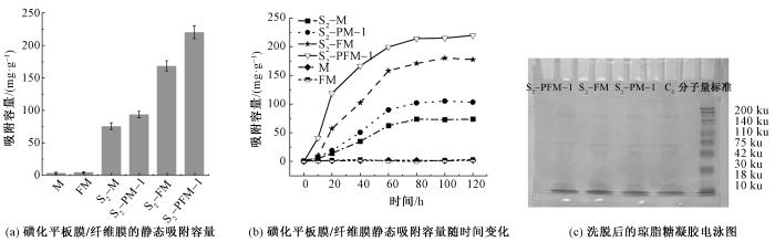 Comparison of lysozyme adsorption performance between flat membrane and fiber membrane materials. (a) Static adsorption capacity of sulfonated flat film/fiber film; (b) Static adsorption capacity of sulfonated flat film/fiber film over time; (c) Eluted agarose gel electrophoresis electropherogram