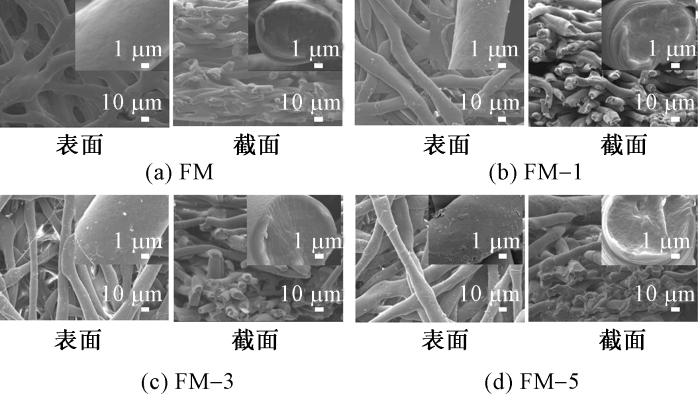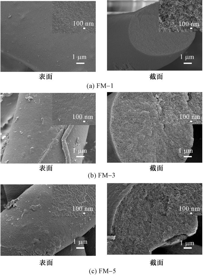 通过对比不同预交联时间样品(FM-1、FM-3、FM-5)经溶胀-超交联1 h后形貌(见图4)发现,预交联时间延长显著提高纤维表面交联点密度,致使其形成致密皮层结构,抑制溶胀剂向纤维内部渗透,导致孔隙生成效率降低。短时预交联(如FM-1)因皮层结构疏松,利于溶胀剂扩散并形成均匀孔隙网络;而长时处理(如FM-5)因过度交联使孔隙数量锐减。基于此,将预交联时间优化至1 h(FM-1)可平衡纤维膜形貌稳定性与孔隙结构的保留,故选定FM-1作为后续研究体系。