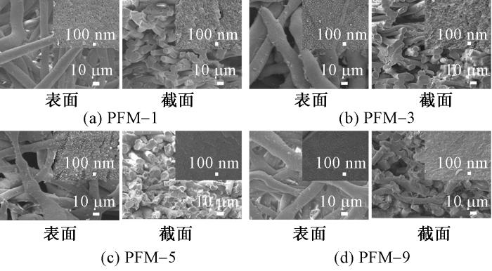 超交联反应:取0.5 g预交联纤维膜FM-1,在40 mL 1,2-二氯乙烷和5.6 mL甲醛二甲缩醛中溶胀12 h,随后加入10 g FeCl3,在80 ℃下分别反应1、3、5、9 h。反应结束后,经索氏提取器依次用甲醇、1 mol/L HCl和去离子水清洗,40 ℃干燥24 h,得到超交联纤维膜(标记为PFM-1、PFM-3、PFM-5、PFM-9)。