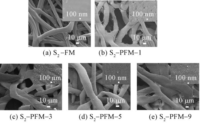 表1示出经过不同时间的预交联与超交联后SEBS纤维膜的比表面积和孔隙率数据。实验数据显示,仅经过预交联处理的膜材料(FM系列)的比表面积(1.978 2~4.092 5 m2/g)较低。经过超交联后的膜材料(PFM系列)的比表面积(5.171 2~19.649 8 m2/g)显著提升,其中PFM-5的比表面积(19.649 8 m2/g)最高,较FM膜材料提升近10倍,同时孔隙率也同步上升至(78.76±1.27)%。然而,继续延长超交联时间至9 h,PFM-9膜材料的比表面积下降至18.663 0 m2/g,证明过高的交联密度会导致孔结构塌缩。此外,S2-PFM-1膜材料的比表面积(6.1710 m2/g)和孔隙率((65.18±2.16)%)相较于PFM-1小幅度提升,表明磺化改性并未显著改变纤维表面的孔结构,而主要改变了纤维膜表面的化学结构(见图 6)。