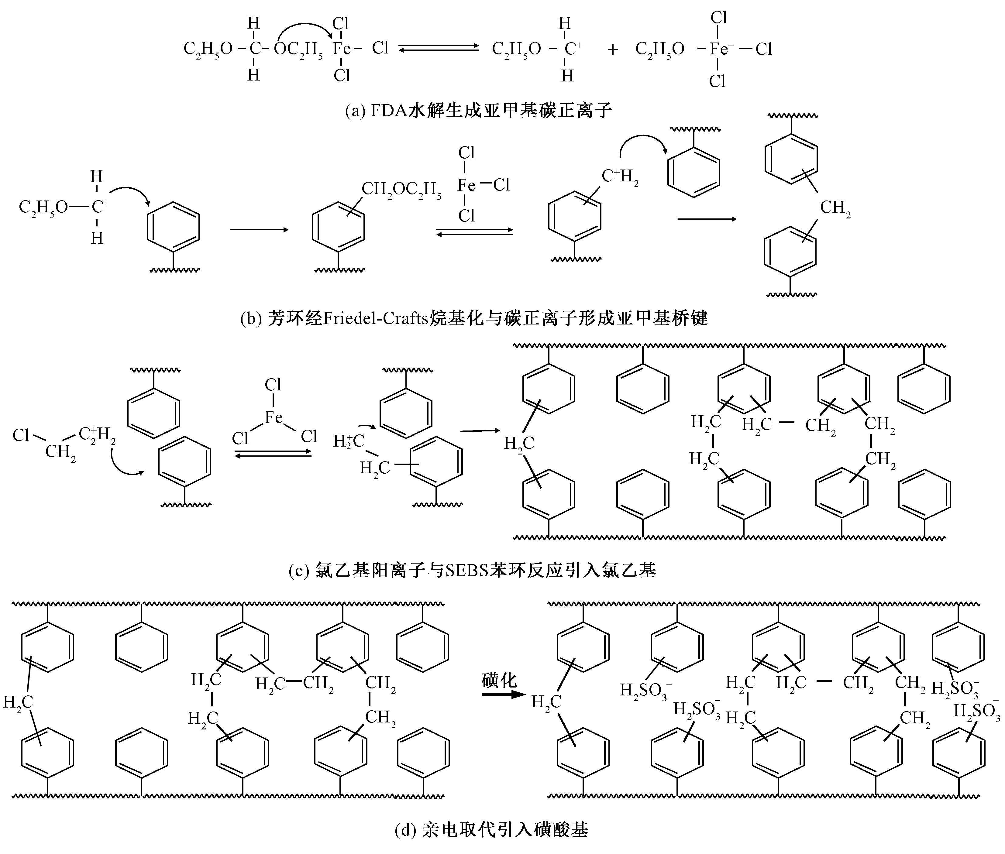| Fig.2 Schematic diagram of chemical reaction process of porous sulfonated SEBS fiber membrane. (a) Hydrolyzation of FDA to form a methylene carbocation; (b) Formation of a methylene bridge bond by aromatic ring with carbocation via Friedel-Crafts alkylation; (c) Chloroethyl cation reacts with benzene rings of SFBS to introduce chloroethyl group;(d) Introduction of sulfonic acid group via an electrophilic substitution reaction |