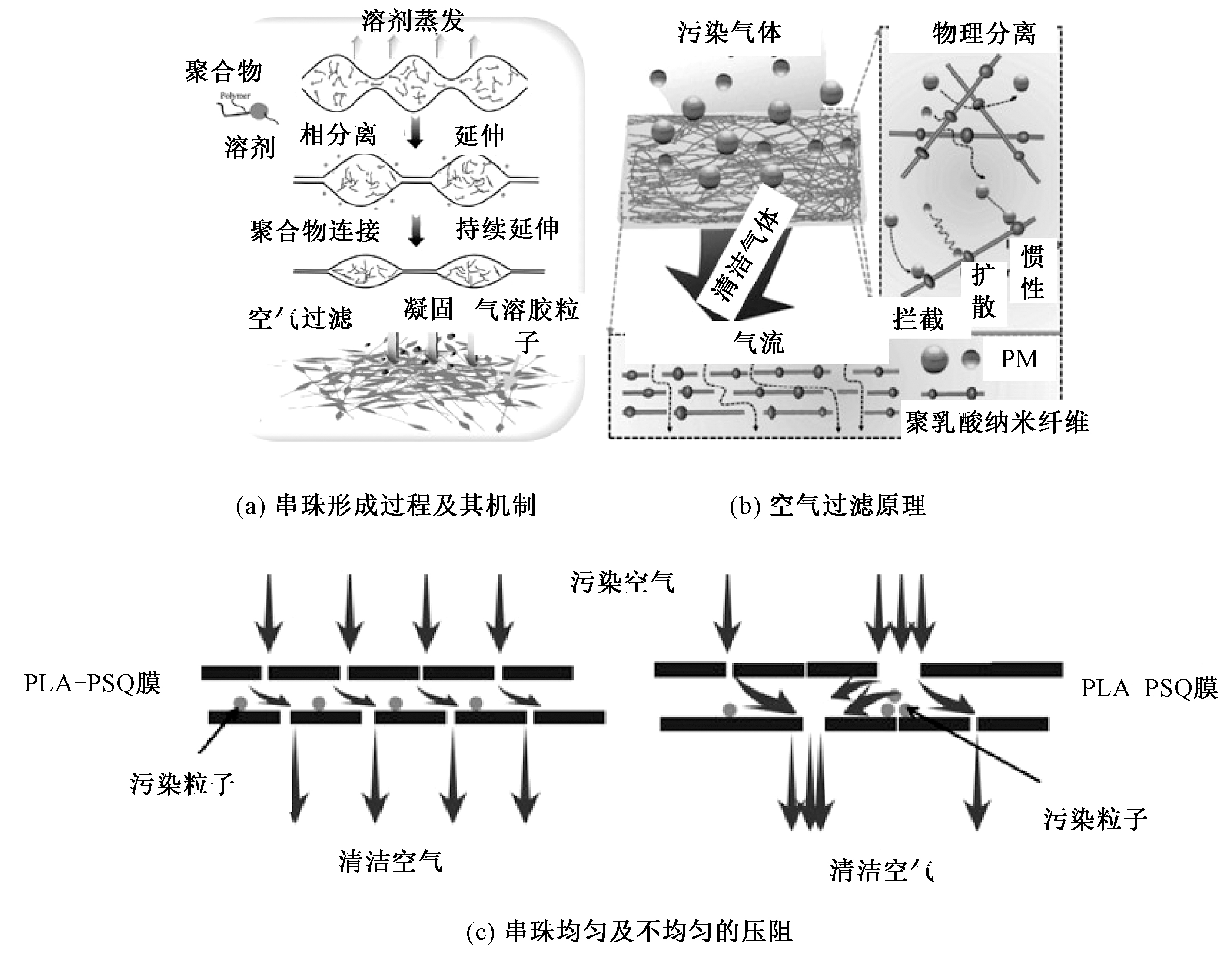 | Fig.2 Formation mechanism and filtration principle diagram of electrospun bead structured nanofiber membrane. (a) Formation process of beads and its mechanism; (b) Air filtration principle; (c) Uniform and uneven pressure resistance of beads |