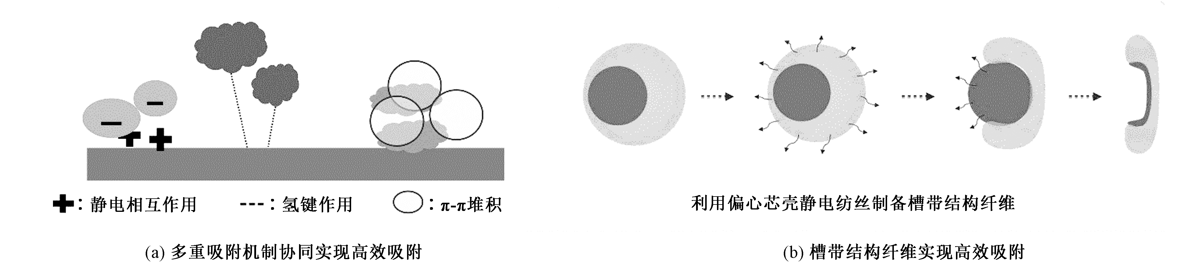 | Fig.3 Application and mechanism schematic of fibrous membrane in dye absorption. (a) Efficient adsorption through multiple adsorption mechanism; (b) Efficient adsorption by fibers with groove banding structure |