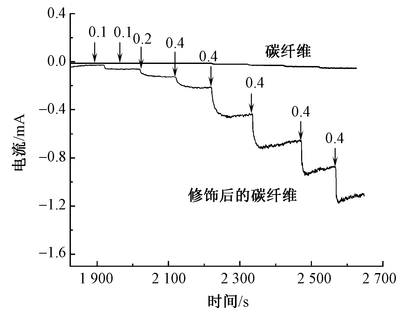 | 图6 连续滴加H2O2的碳纤维和修饰后碳纤维的电流响应曲线 注:图中数字为加入的H2O2的浓度,单位为mmol/L。 |