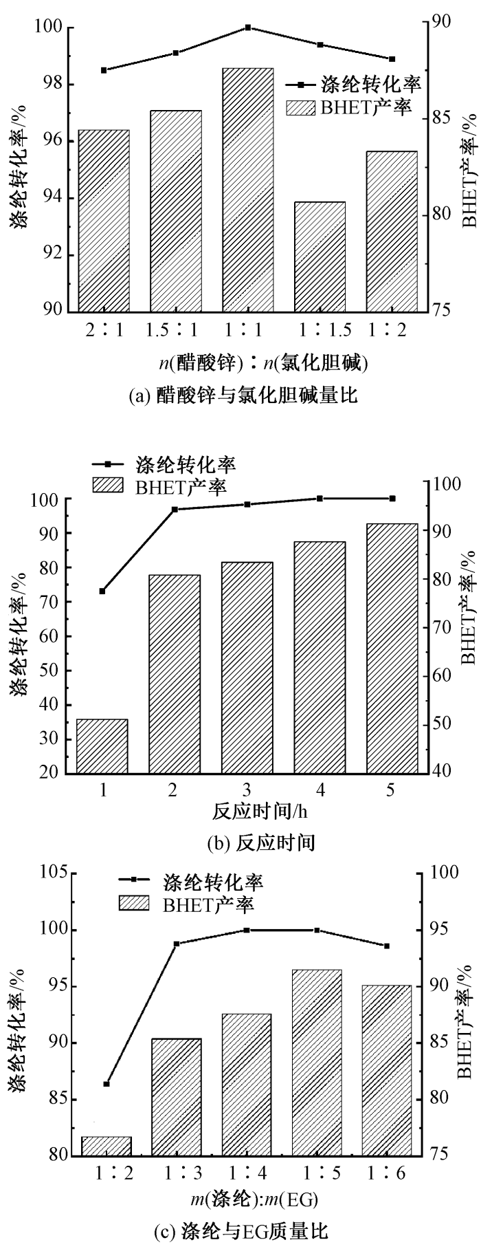 在醋酸锌与氯化胆碱的量比为1∶1,反应温度为180 ℃,涤纶与EG的质量比为1∶4,催化剂质量占涤纶0.2%的条件下,不同反应时间下涤纶转化率和BHET产率测试结果如图2(b)所示。随着反应时间的增加,PET转化率和产物BHET产率都呈现升高的趋势。在开始反应时间为1 h时,涤纶转化率和产物BHET产率最低,分别为73.1%和51.2%;当反应达到2 h时,转化率和产率迅速增加,然后趋于平缓;当反应时间到5 h时,涤纶转化率达到100%,产物产率可达91.3%。这是因为随着反应时间的增加,涤纶大分子链在EG存在下开始膨胀,纤维结构逐渐被分解,分子链被破坏,醇解反应更加彻底,进而BHET产率有所增加。