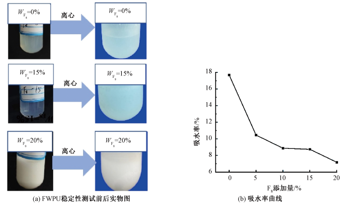 Physical diagram of fluorinated waterborne polyurethanes before and after stability test (a) and water absorption curve(b)