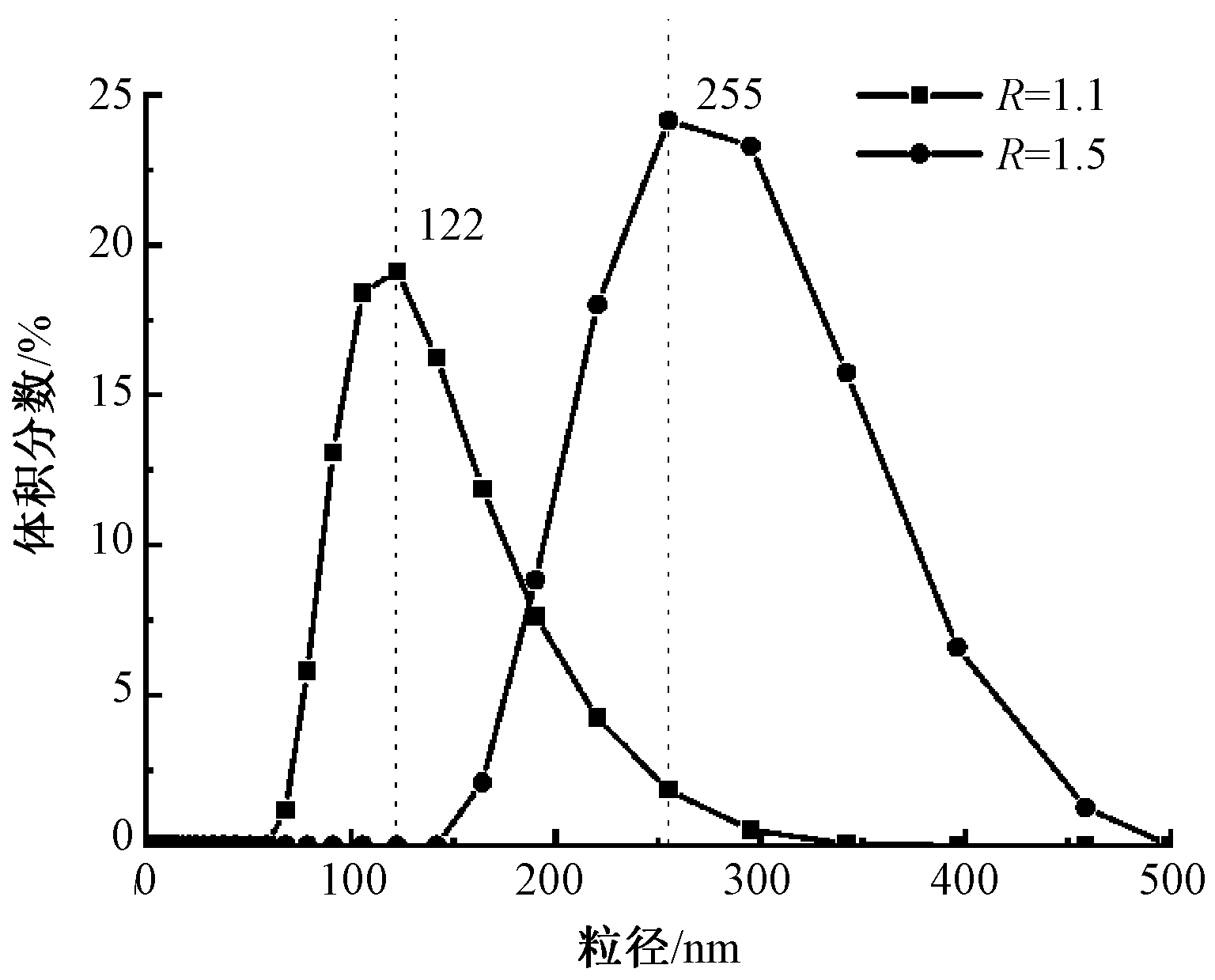 | Fig.4 Influence of R values on particle size of fluorinated waterborne polyurethane |