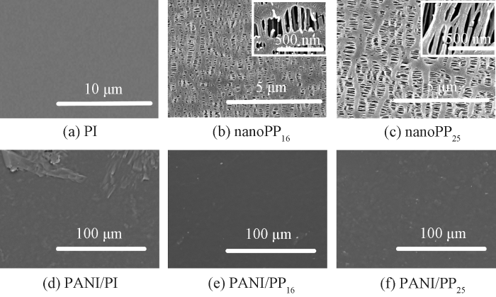 图2示出PI、nanoPP16、nanoPP25基材薄膜以及涂覆相同厚度聚苯胺的PANI/PI、PANI/PP16、PANI/PP25薄膜形貌结构的扫描电镜照片。可知不同薄膜的微观结构存在显著差异,图2(a)显示,PI薄膜表面光滑,无明显孔隙结构。对于nanoPP薄膜:图2(b)中,nanoPP16呈现扁长且相互贯通的狭缝状多孔结构,孔径分布集中且规则;图2(c)中,nanoPP25的孔隙结构与nanoPP16相似,但孔径更大且分布更宽泛,多为微米级孔隙。因此,nanoPP薄膜整体表现出稳定且均匀的孔隙结构,有利于聚苯胺在其表面附着。如图2(d)所示,涂覆相同厚度聚苯胺涂料后,PI薄膜因含有极性基团而具有较高的表面能,聚苯胺可附着在薄膜表面,但分布不均匀,存在少量裂纹。相比之下,PANI/PP16,PANI/PP25表面聚苯胺涂层紧密附着,形成光滑的低发射率表面。
