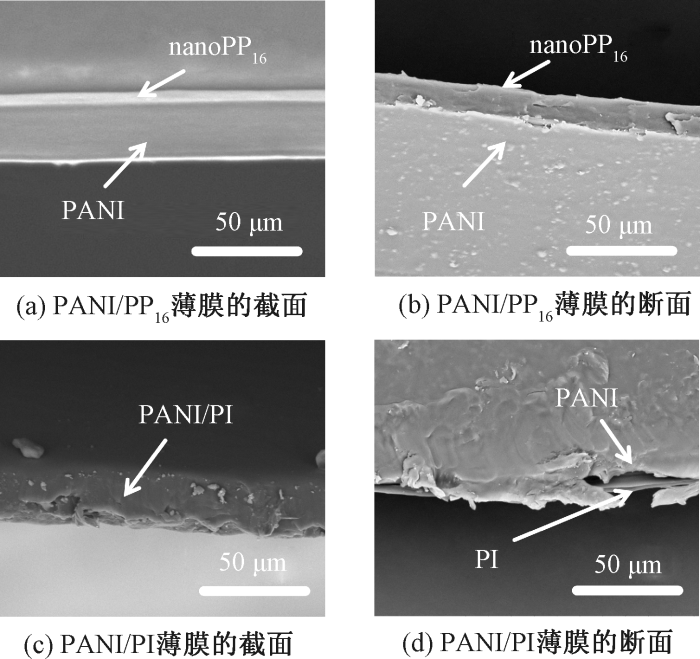 SEM images of cross-sections and sections of flexible films. (a) Cross-section of PANI/PP16 film;(b) Section of PANI/PP16 film; (c) Cross-section of PANI/PI film; (d) Section of PANI/PI film
