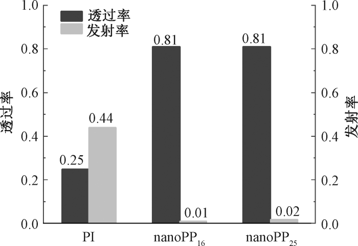 将所选取的薄膜PI、nanoPP16、nanoPP25,用无水乙醇进行充分洗涤干燥,基于课题组前期对聚苯胺(PANI)涂料体系参数的深入研究[18],设置42 μm的高度将PANI-CSA涂料用刮刀均匀涂覆在薄膜上,室温下自然干燥,制得柔性低发射率薄膜PANI/PI、PANI/PP16、PANI/PP25。