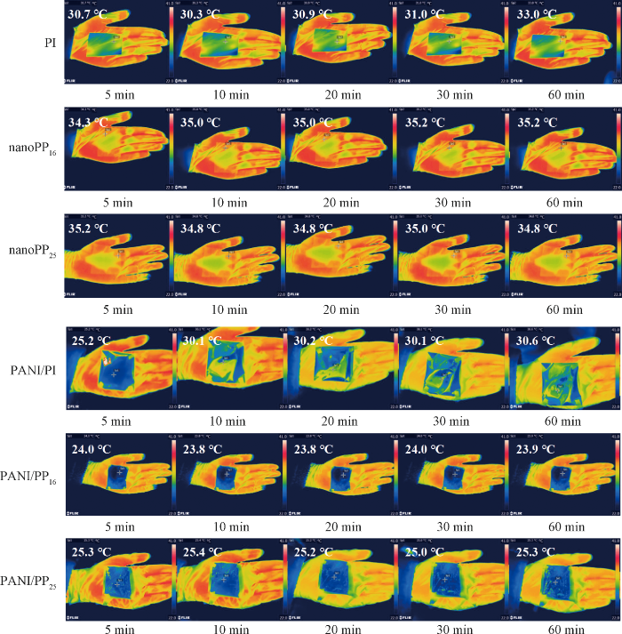 图7示出PI、nanoPP16、nanoPP25、PANI/PI,PANI/PP16和PANI/PP25薄膜在60 min内于人体手掌上的红外隐身效果。
