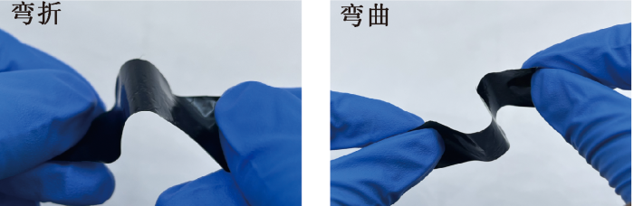 图8示出PANI/PP16薄膜的柔性性能。由图可知,纳米多孔聚丙烯薄膜的特殊多孔结构和优异柔性有效中和了聚苯胺作为刚性聚合物的脆性问题。nanoPP薄膜的纳米孔隙结构通过机械互锁效应以及分子间范德华力的协同作用,有效抵抗界面剥离,因此,PANI/PP16薄膜可在不使用高发射率黏合剂的情况下将聚苯胺涂料紧密附着在nanoPP16薄膜表面,随意弯曲扭转都不会使聚苯胺涂层剥落,不仅具有更低的红外发射率,还兼具优异的柔性,更适合应用于人体可穿戴红外隐身材料。