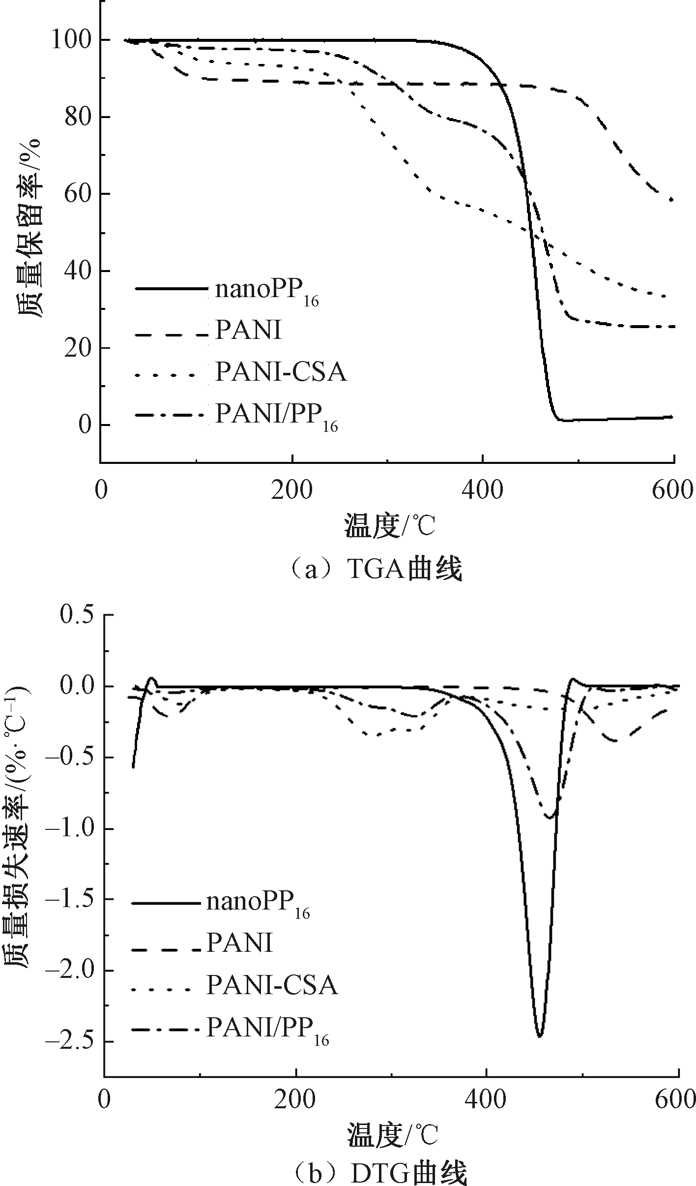 | 图9 nanoPP16、PANI、PANI-CSA和PANI/PP16在氮气条件下的TGA曲线和DTG曲线 |