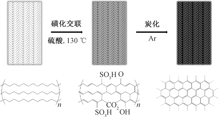 图1示出PE机织物炭化过程示意图和磺化反应机制。首先,将厚度为1 mm的PE机织物裁剪成尺寸为40 mm × 25 mm的矩形,并将其放入250 mL茄形烧瓶,浸泡于100 mL浓硫酸中。接着,在130 ℃的油浴中搅拌加热,进行磺化交联反应,磺化过程持续3、6或9 h。磺化后,将样品冷却至室温,取出并用去离子水及丙酮洗涤5次,以去除副产物及残余硫酸,然后在80 ℃下真空干燥12 h。干燥后的样品置于管式炉中,在氩气气氛下,以10 ℃/min的速率加热至400 ℃,然后以5 ℃/min的速率升温至800、900或1 000 ℃进行炭化,最后以10 ℃/min的速率降至室温。
