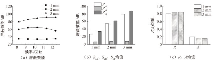 Electromagnetic shielding performance of samples with different thicknesses. (a) Se value; (b) SeA,SeR and SeT values; (c) R and A values