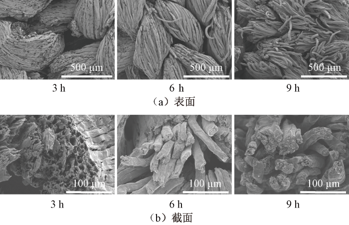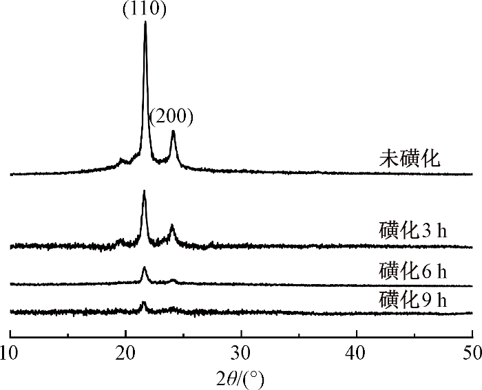 不同磺化时间处理的样品截面形貌如图6所示。磺化处理3 h的样品截面出现空心现象,结合XRD图谱与碳收率数据可知,短时间磺化未能使纤维进行充分的交联反应。由于聚乙烯纤维的磺化交联反应受溶剂硫酸的扩散控制,纤维内部的聚合物相较外部交联程度低,使得炭化过程中纤维内部出现较大程度的降解,导致空心结构[24]。经6 h磺化处理后的样品结构较为完整,虽有轻微的翘曲和弯曲现象,但整体形态接近原始编织结构,较3 h处理样品,纤维截面明显更加完整。进一步延长磺化时间至9 h后,样品的纤维截面几乎完全实心,然而纤维呈现出散乱的弯曲和翘曲现象。由此得出在长时间磺化过程中织物交联更加充分,但不能避免不规则形态的产生[25]。